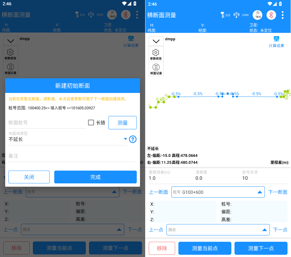 2.进入断面测量界面后,软件会根据当前桩号计算横断面图并绘制显示,且显示当前左右最末端(坡脚)的偏距、高程数据;