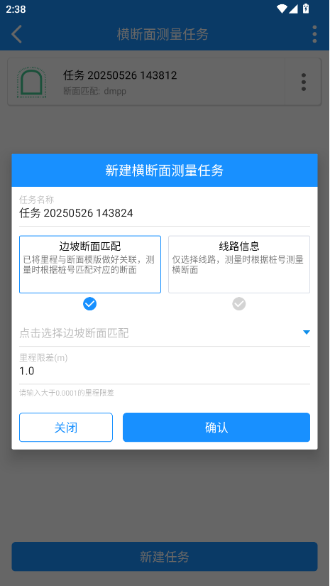 2.点击“新建任务”按钮,输入任务名称、里程限差及选择两种不同的设计模式: