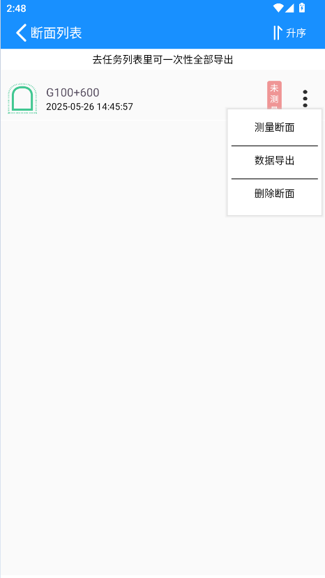 2.点击左侧“断面记录”按钮,查看断面测量记录任务列表可进行删除、导出操作;