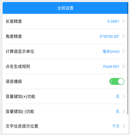 您可以在进行测量任务前对默认的部分参数选项进行修改,这些参数主要分为全局设置和放样功能设置;