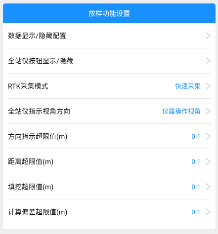 5.超限值设定(m):当放样时,会计算并显示方向指示、点理论与实测的平面距离、高差(即填挖)以及各维度偏差值,当计算的值超高设定的限差后,APP会已红色字体显示,如果开启了语音播报,则还会进行语音提醒;