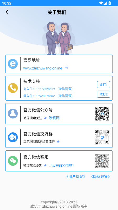 点击“关于我们”可获取致筑网官网地址,技术支持人员的联系电话,也可关注致筑网微信公众号或者直接联系微信客服。在这里可以查看到我们的《用户协议》和《隐私政策》