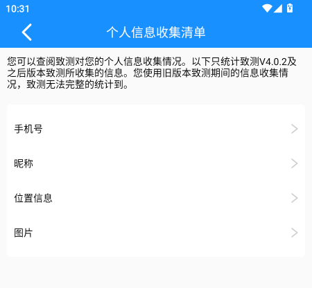您可以查询致测对您的个人信息收集情况,以下只统计致测v4.0.2及之后版本致测所收集的信息。