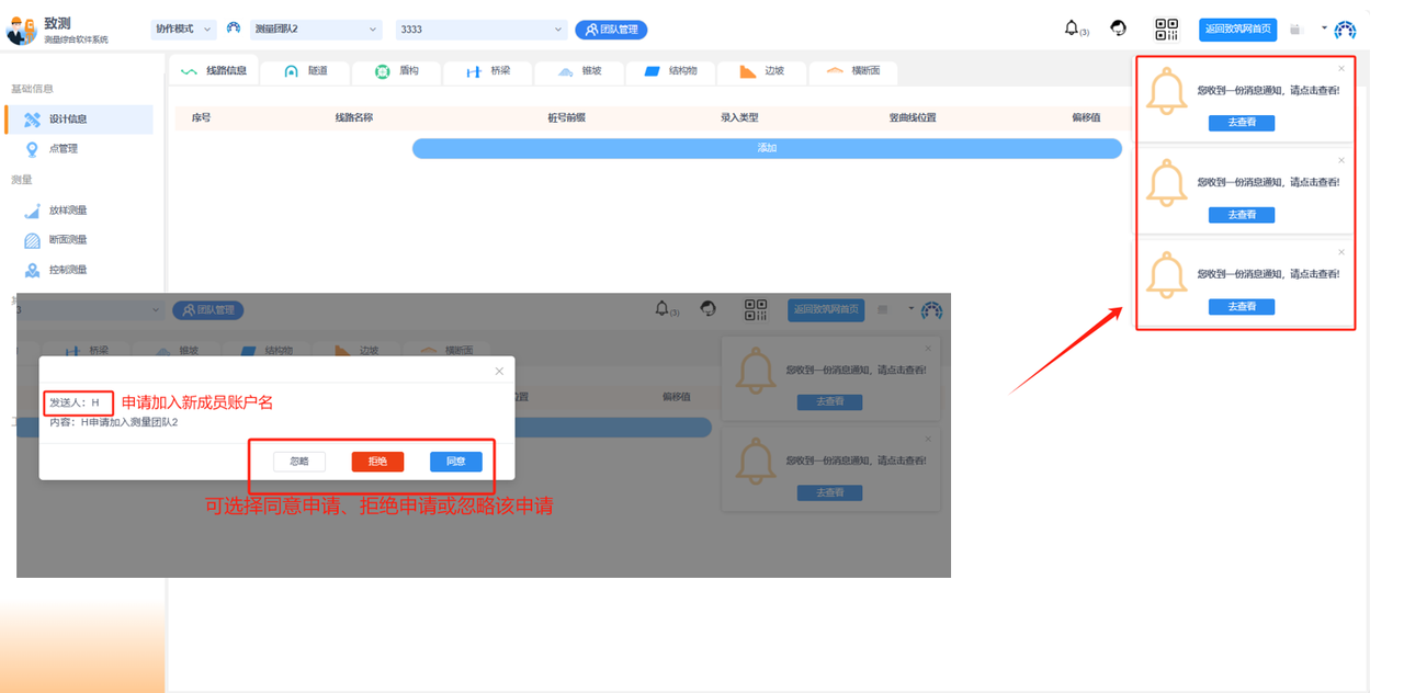 注意:“新成员的审批”需要刷新后才能显示最新的申请提示,也会在平台页面显示消息提示,点击“去查看”即可处理新成员审批信息