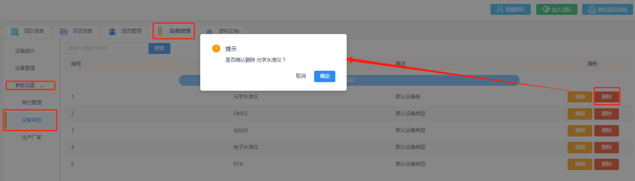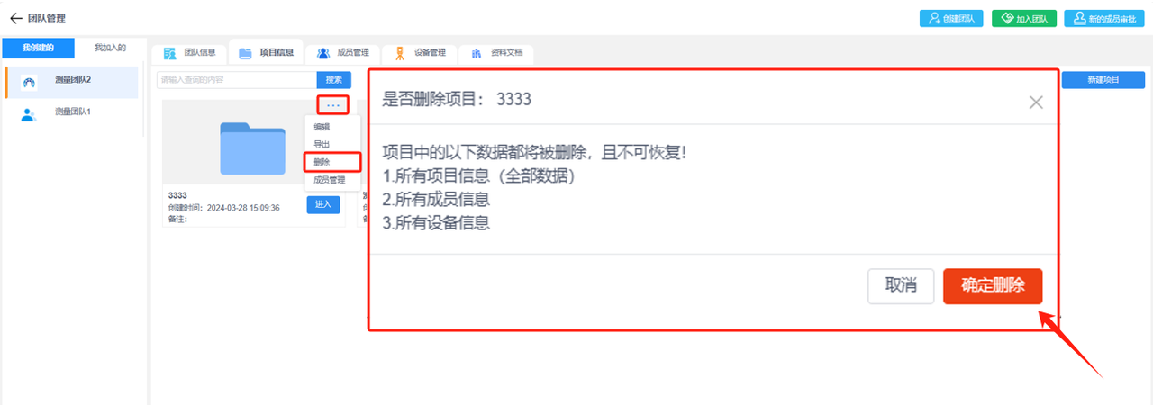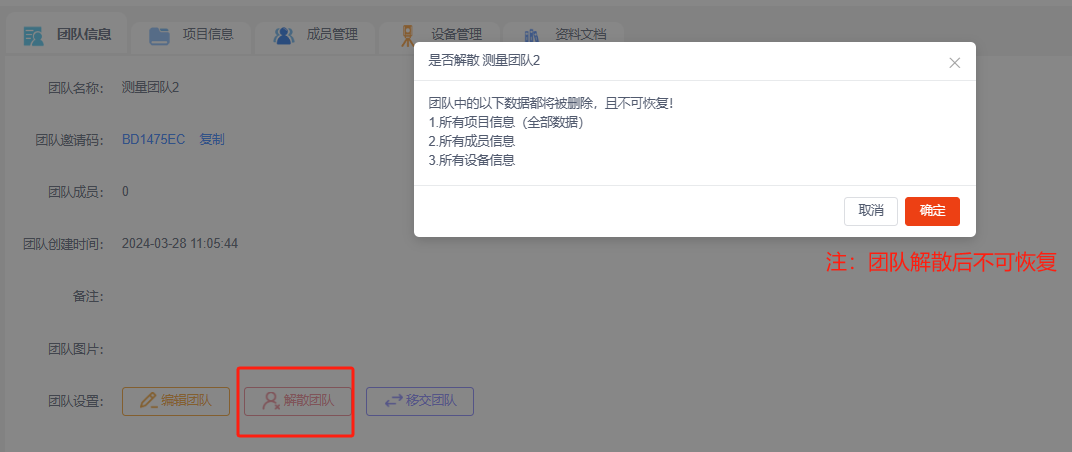 ②解散团队:团队解散后,团队中的数据都会被删除且不可恢复,包括所有项目信息、所有成员信息和所有设备信息都将全部删除。