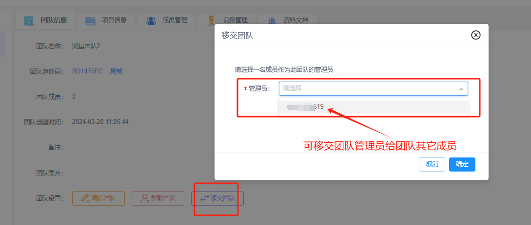 ③移交团队:每个团队的创建者默认是该团队的管理员,后期可以通过“移交团队”将管理员移交给该团队其它成员