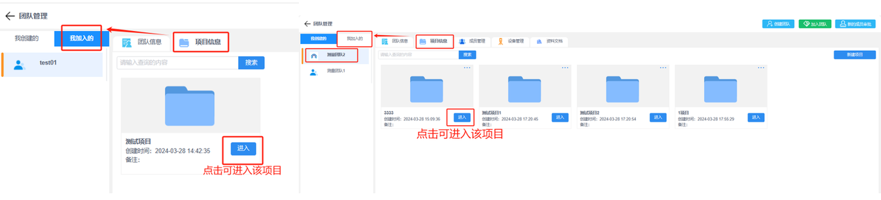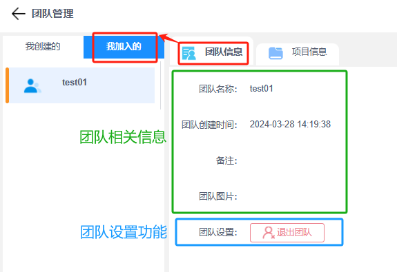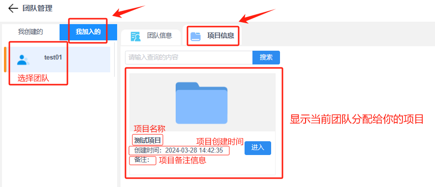 注意:管理员可以进行整个团队的信息管理,团队成员仅可以查看团队信息和他所属的项目信息