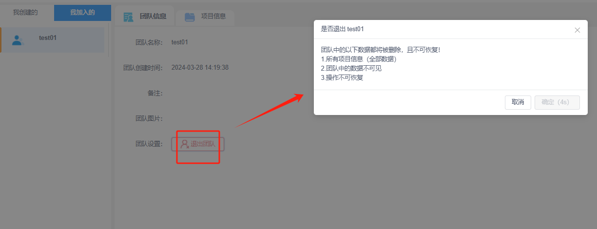 退出团队:退出后会删除团队下所有的项目信息、团队中的数据会不可见且该操作不可恢复,只能重新申请加入团队。