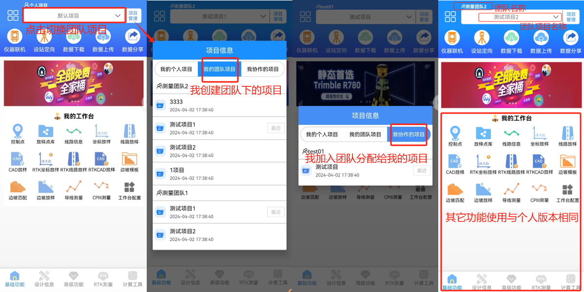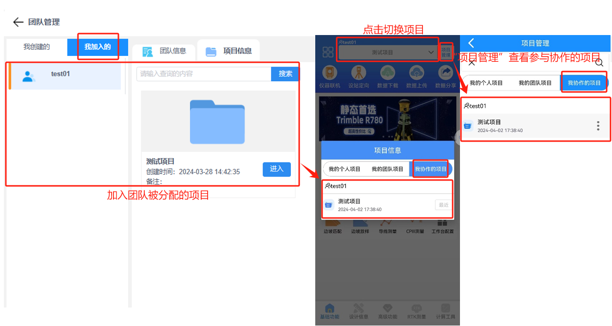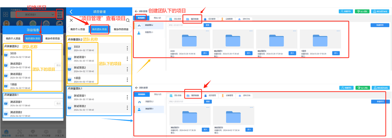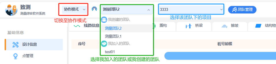在保持个人模式使用的情况下,致测新增协作模式,两个模式均可自由切换。协作模式主要用于团队测量工作,可将项目分配给各个负责人,还可以对团队进行设备的管理和文档资料的管理。