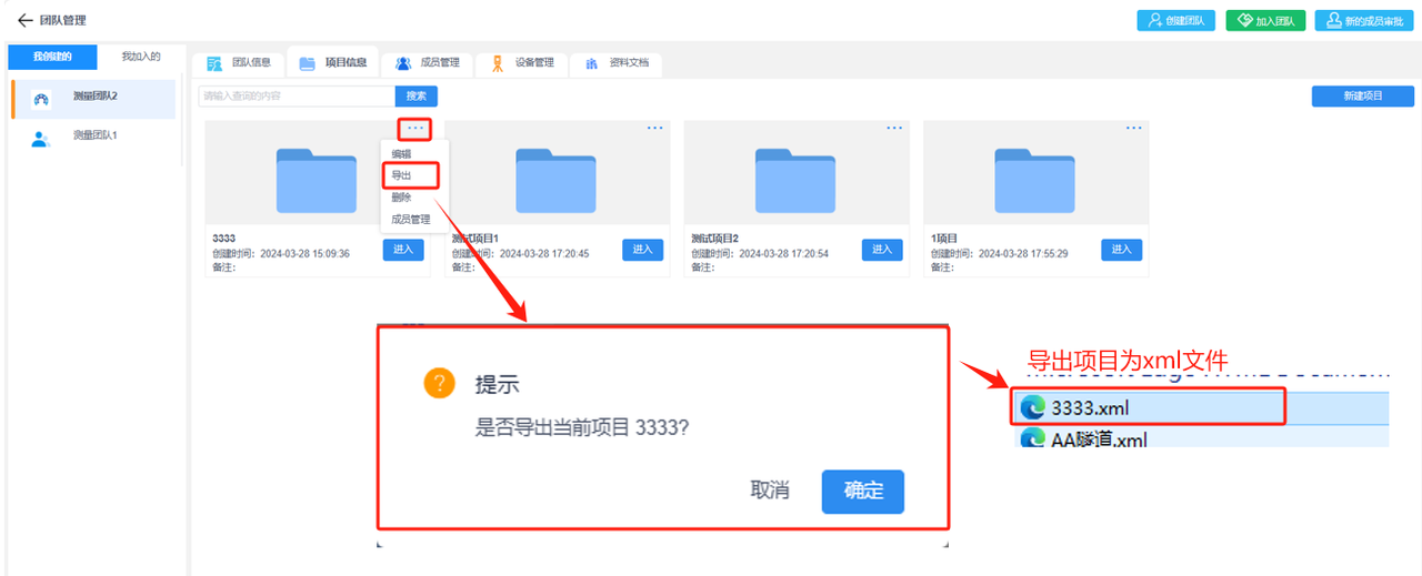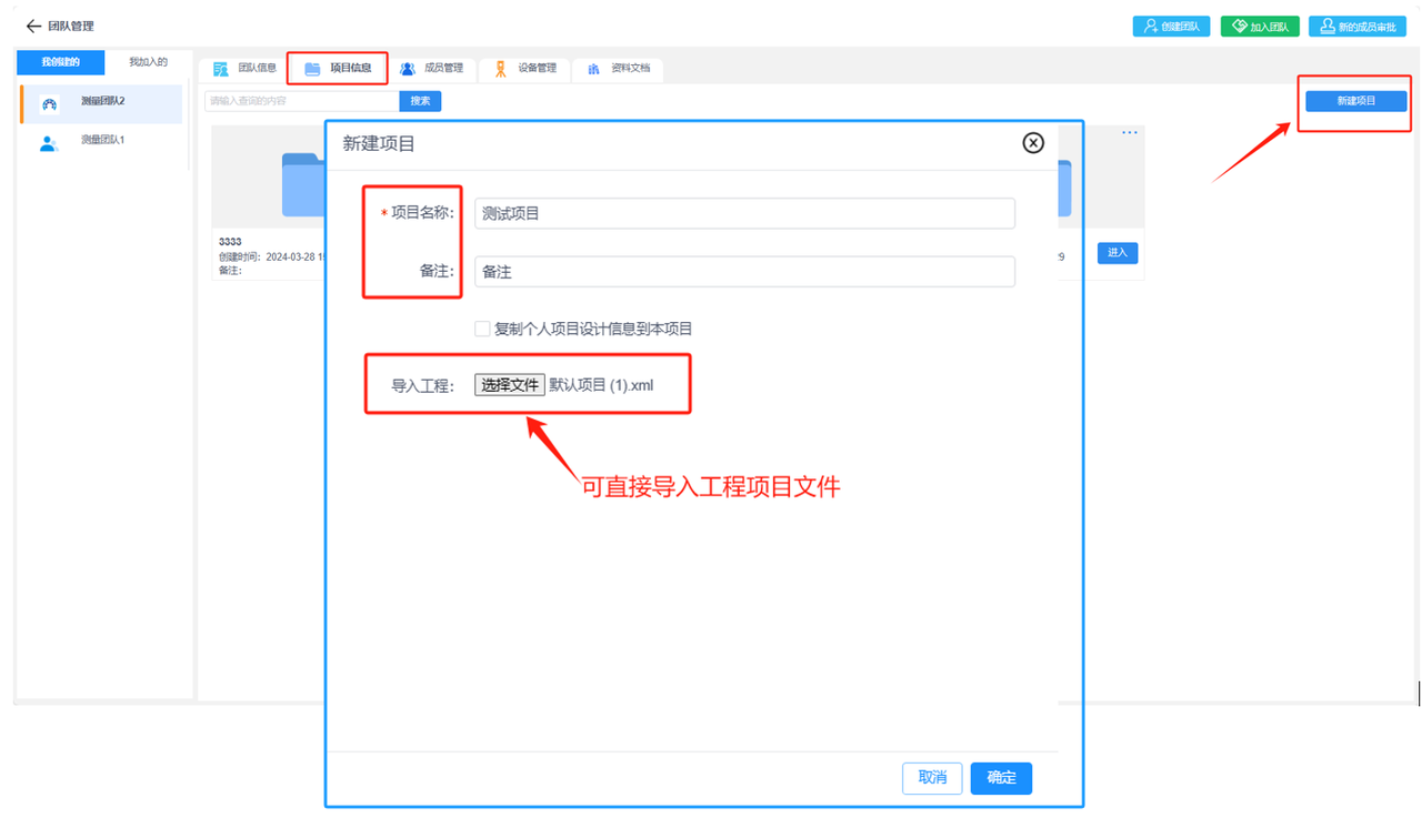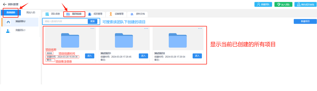 团队创建者(管理员)可在“我创建的”页面下选择“项目信息”后“新建项目”,也可查看当前团队下的所有项目列表并对项目进行编辑、导出、删除或成员管理等操作;如果是团队成员可在“我加入的”页面下选择“项目信息”查看当前团队分配给你的所有项目。