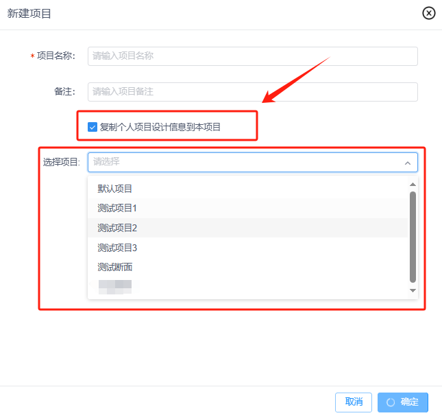 注意:可复制个人项目设计信息到本项目,勾选“复制个人项目设计信息到本项目”然后选择要复制的项目即可。
