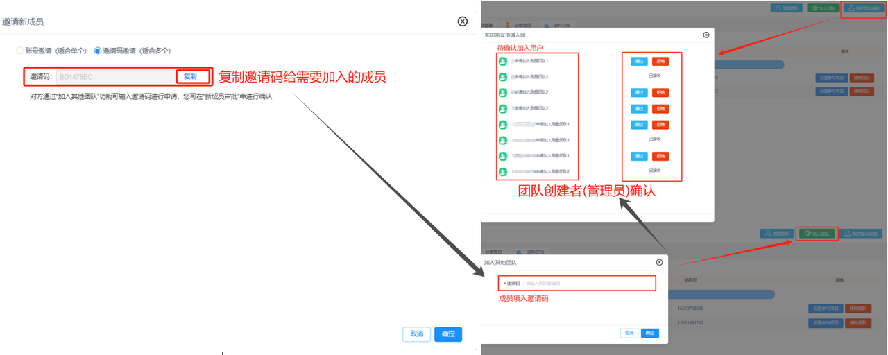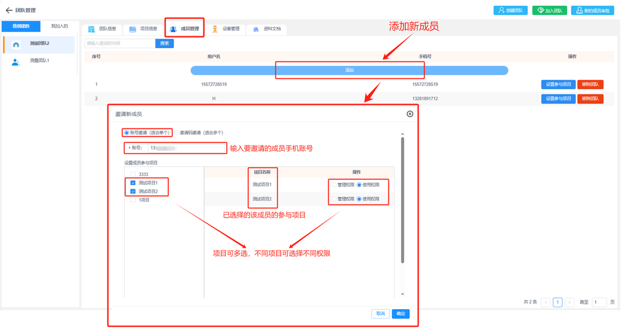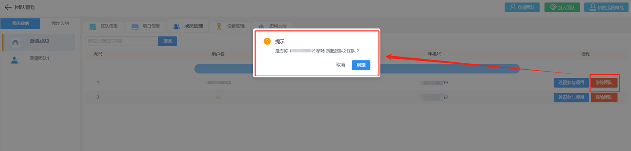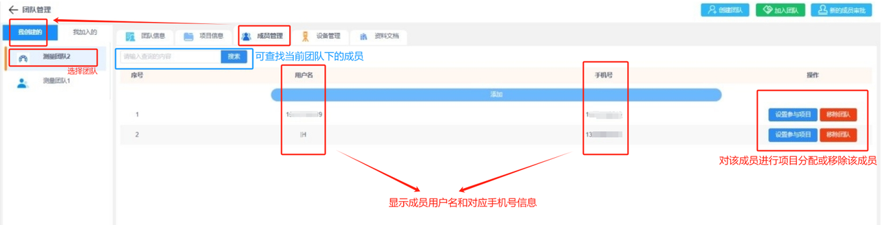 a.成员列表:可显示该团队下的所有成员,显示信息包括成员的用户名和对应的手机号。可在操作列设置对应成员参与项目或将该成员移除团队。