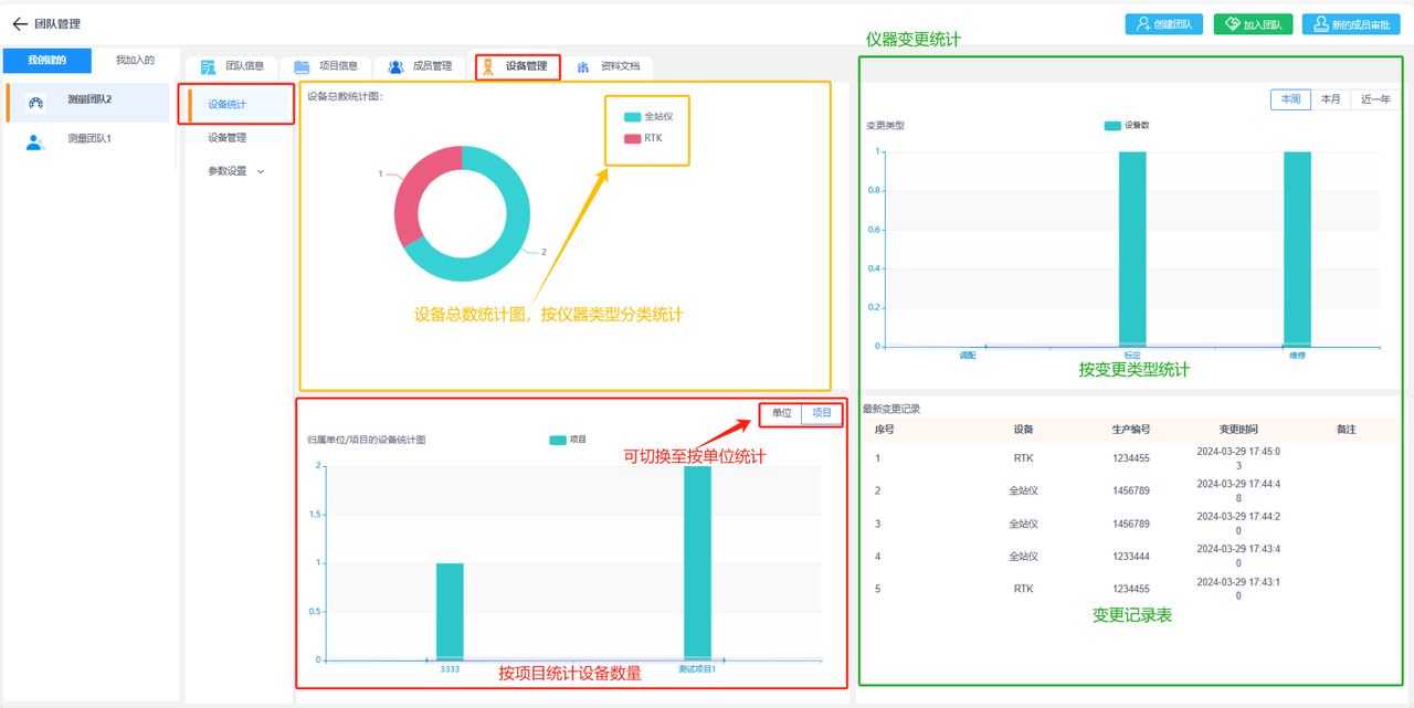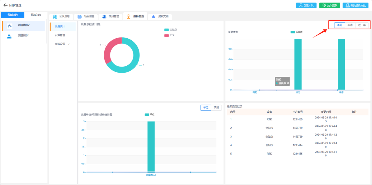 a.设备统计:显示当前团队下得设备统计信息,包括按类型统计设备数量,按单位统计设备数或者按当前团队下的项目统计设备数。还包括这些设备的变更记录统计,有按变更类型统计设备数和最新的变更记录表。