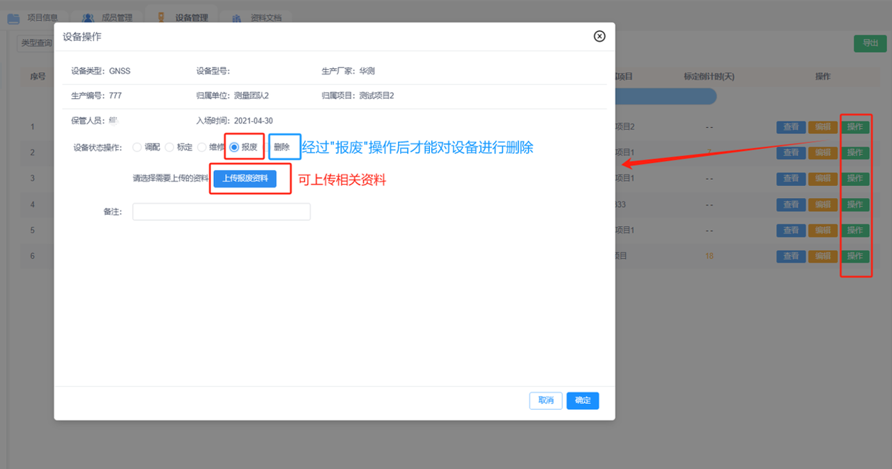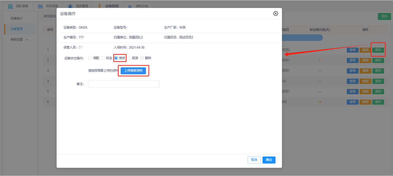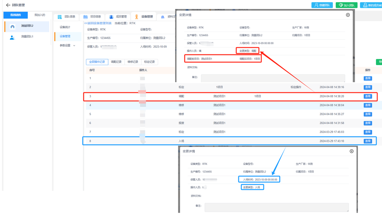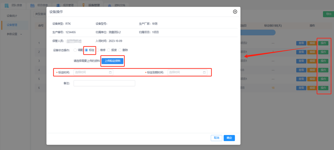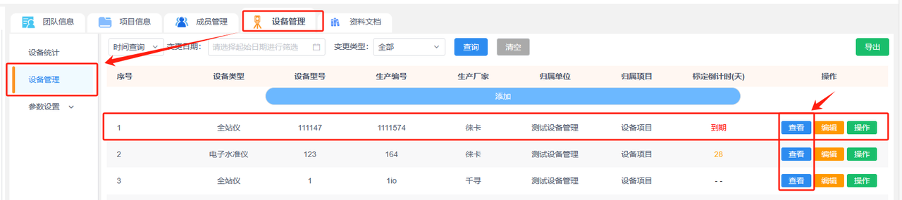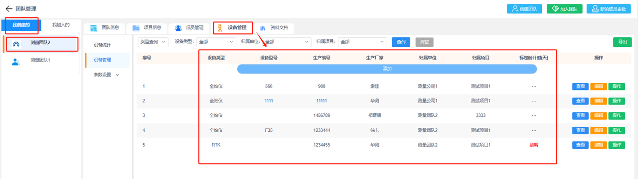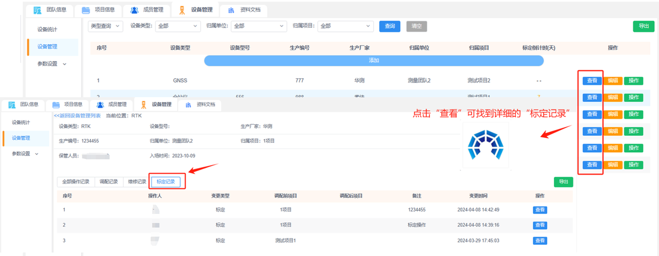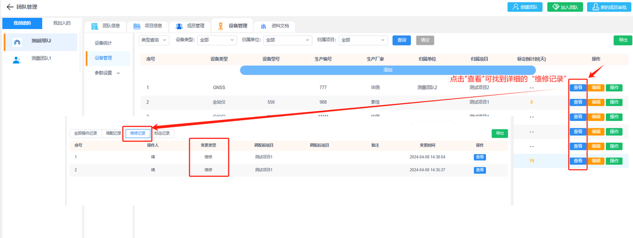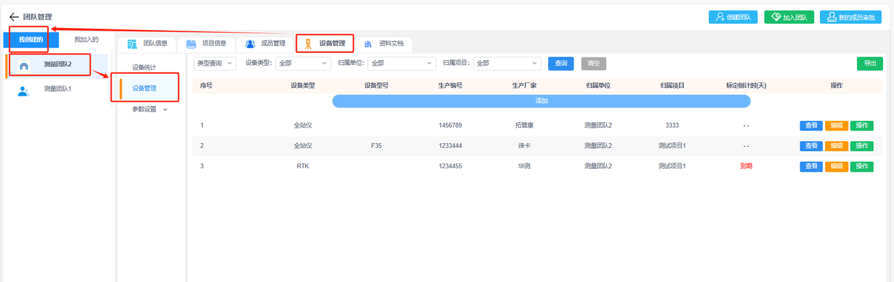 b.设备管理:添加团队下的设备便于管理,已添加的设备可进行设备操作记录(调配、维修和标定),并查看该设备的详细信息和操作记录。