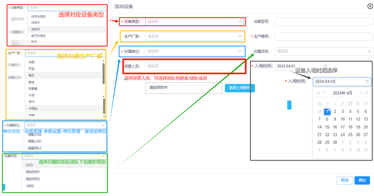 添加设备:录入设备类型、设备型号、生产厂家、生产编号、归属单位、归属项目、保管人员和入场时间等相关信息,添加设备到设备管理列表中。