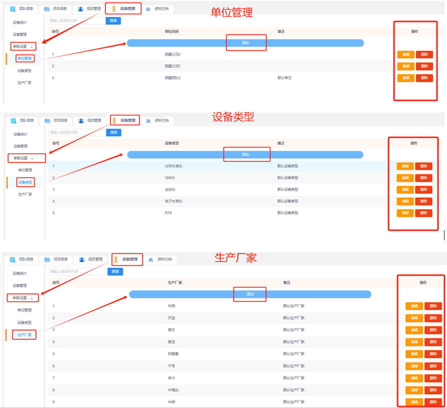 c.参数设置:在添加设备时,设备类型和生产厂家的选择平台会提供默认选项,如果找不到您需要的设备类型或生产厂家,可在“参数设置”中添加、编辑或删除。归属单位也可以在“参数设置”中添加、编辑或删除。