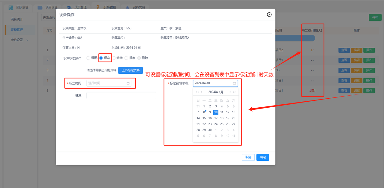设备列表:设备管理列表中可显示已添加设备的设备类型、设备型号、生产编号、生产厂家、归属单位、归属项目和标定倒计时(天)。