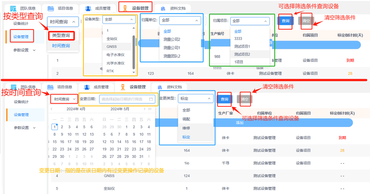 ①类型查询:可将设备类型、归属单位、归属项目作为筛选条件查询设备。