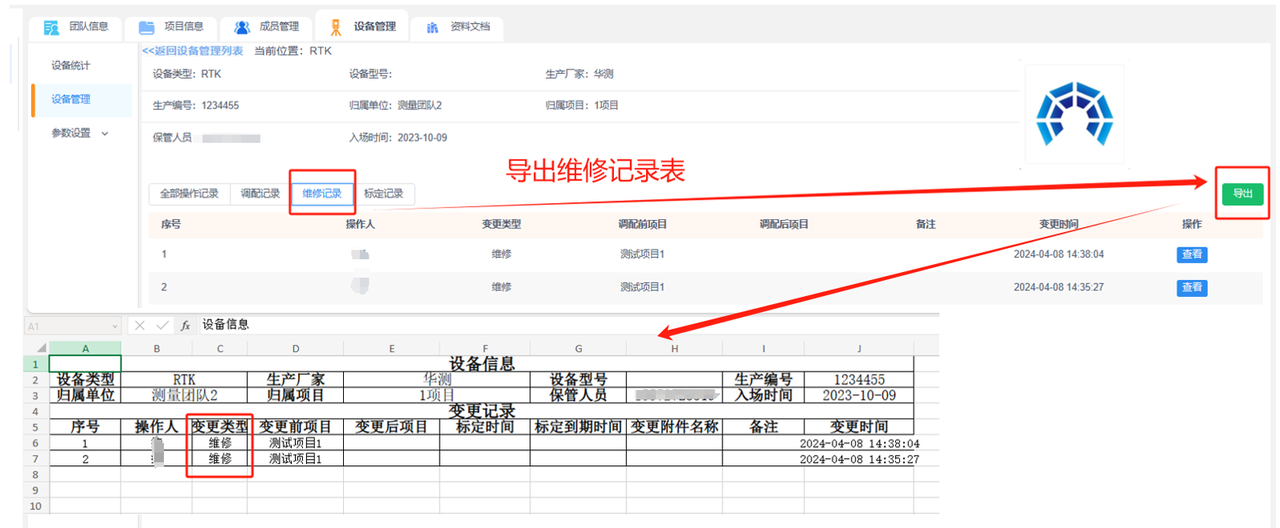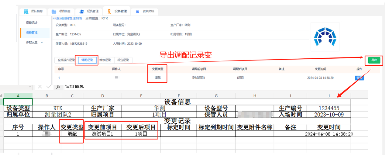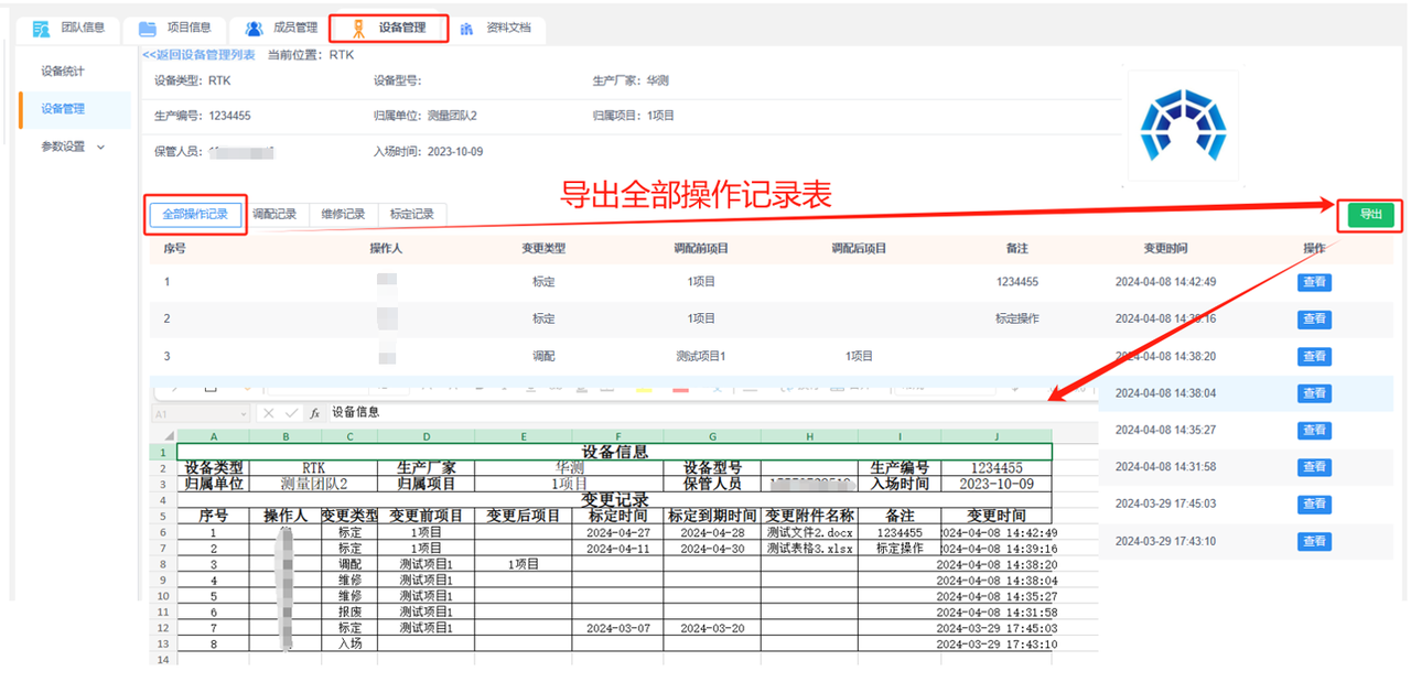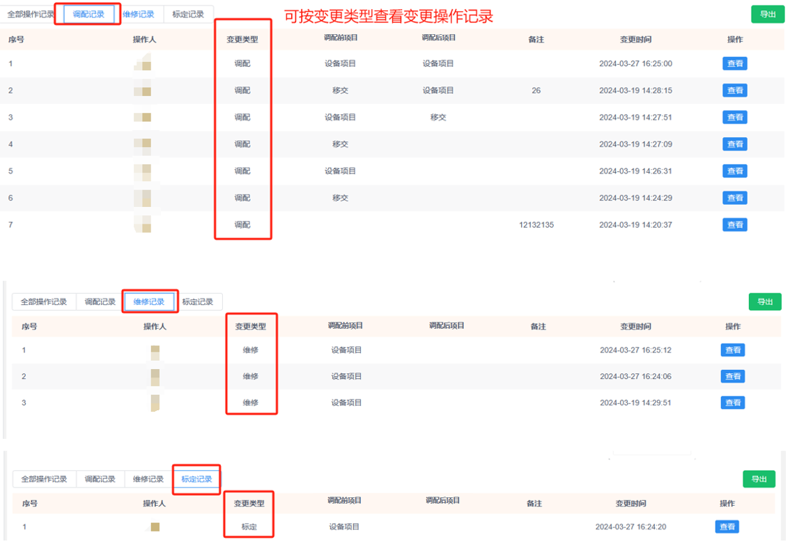 ②导出操作记录表:可导出全部的操作记录或按变更类型导出调配记录、维修记录或标定记录。