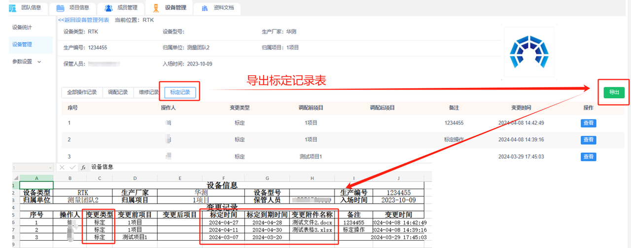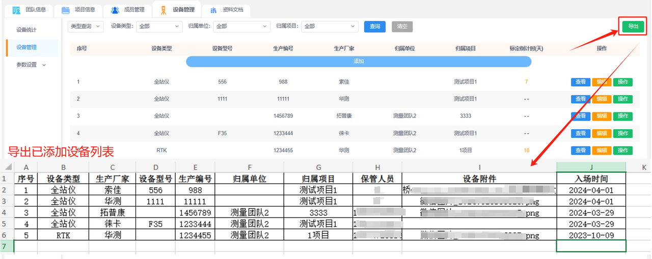 ①导出设备列表:可导出该团队下所有已添加设备列表,包括设备类型、生产厂家、设备型号、生产编号、归属单位、归属项目、保管人员、设备附件和入场时间等信息。