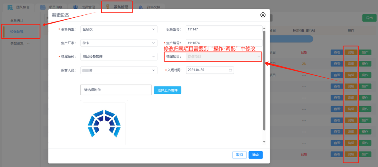 编辑设备:可编辑修改设备信息,包括设备类型、生产厂家、归属单位、保管人员、设备型号、生产编号、购置时间和上传附件。