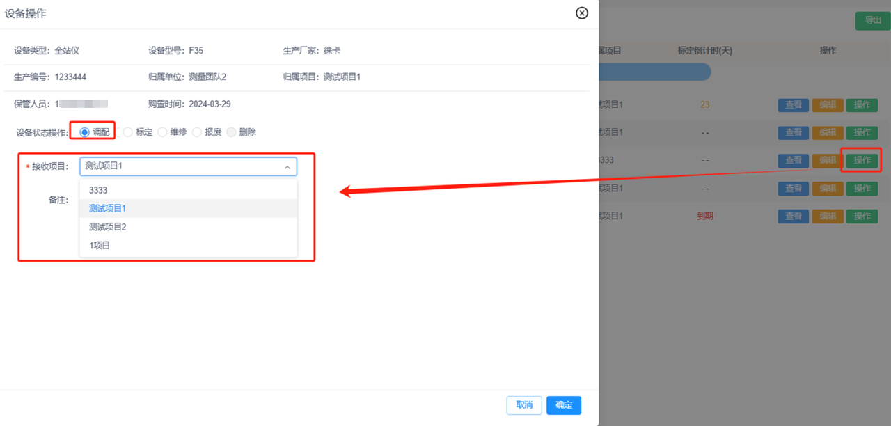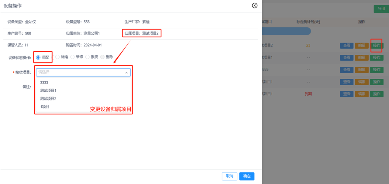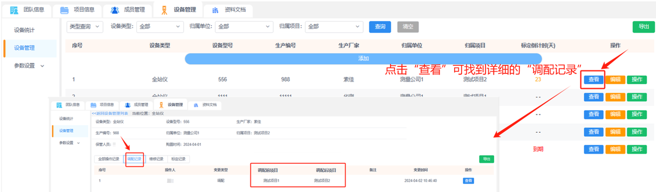 ①调配:更改设备的归属项目,可以在“查看-调配记录”中查看设备的归属项目变更记录。