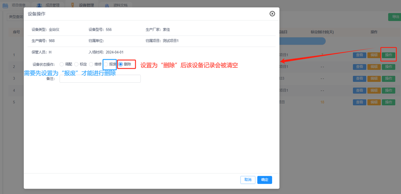 注意:设置为报废状态后仪器才可以“删除”。