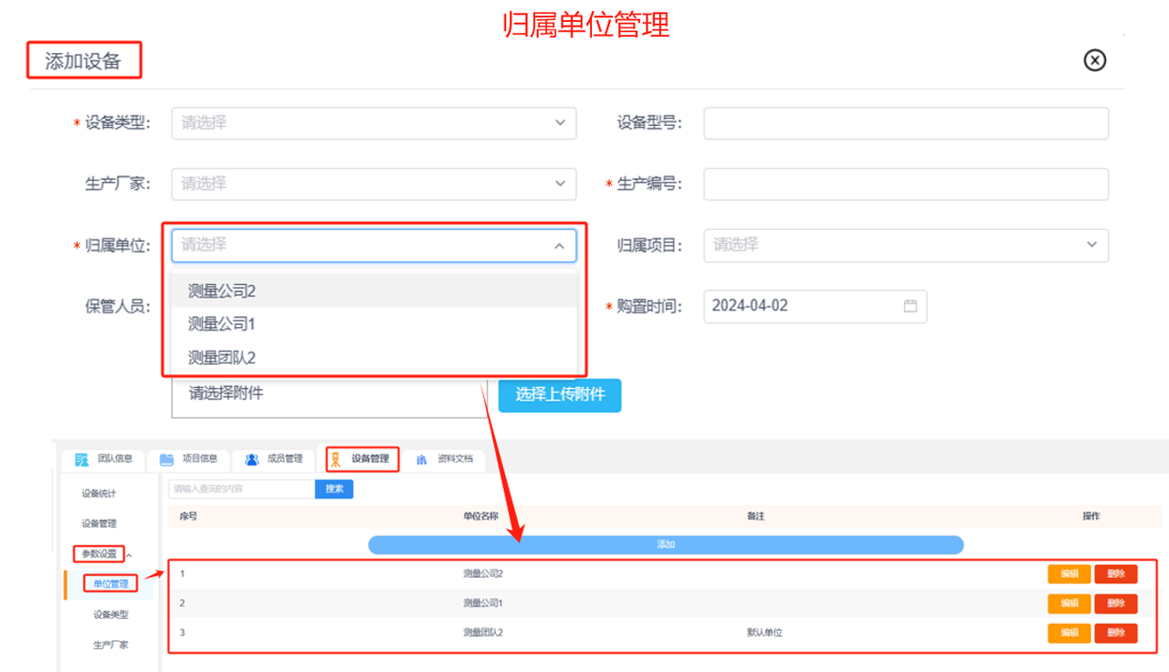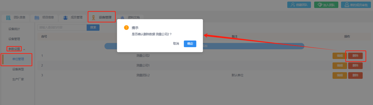 单位管理:添加设备时,平台会设置当前团队为默认单位选项,可以在“参数设置-单位管理”中添加归属单位,编辑归属单位信息或删除单位。