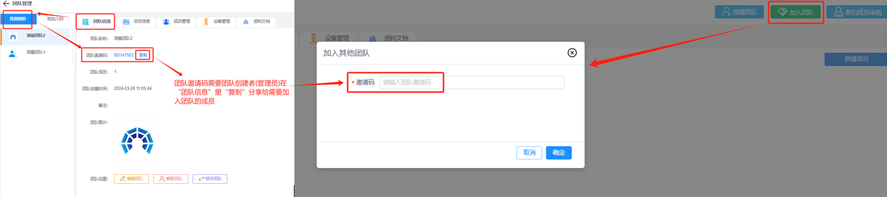 点击右上角“加入团队”,可通过输入邀请码加入其它团队。
