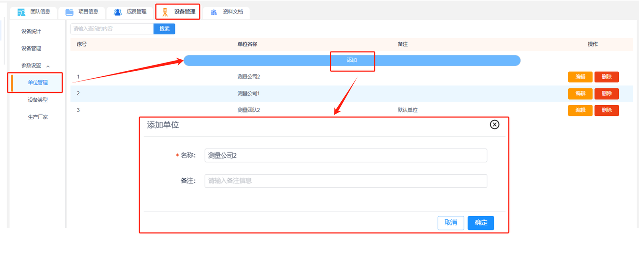 ①添加单位:输入单位名称和备注信息,添加单位到列表。