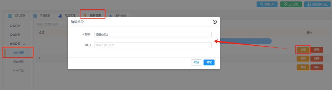 ②编辑单位:可编辑修改单位名称或备注信息。