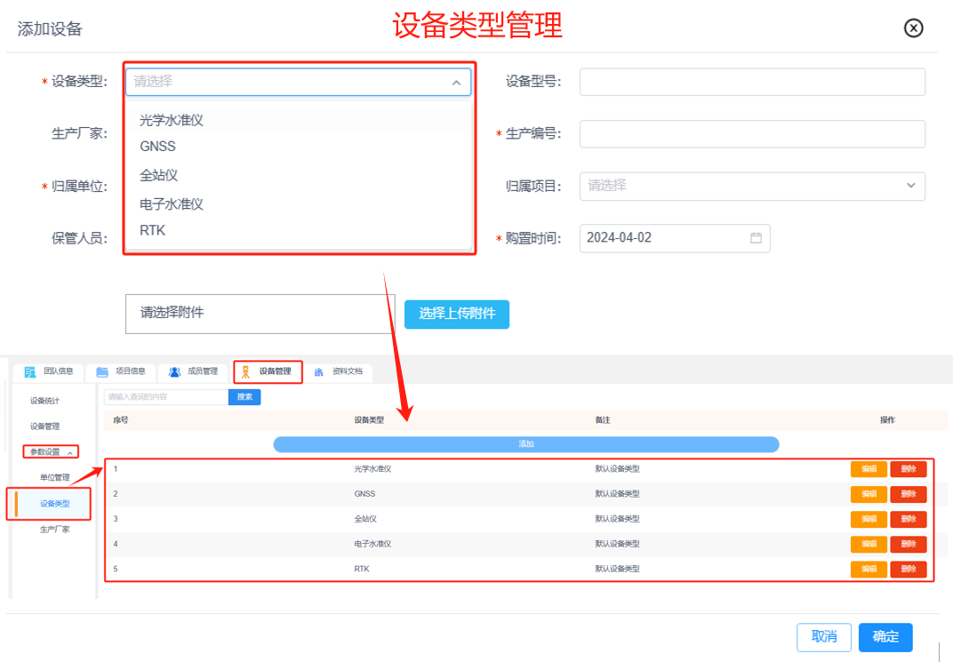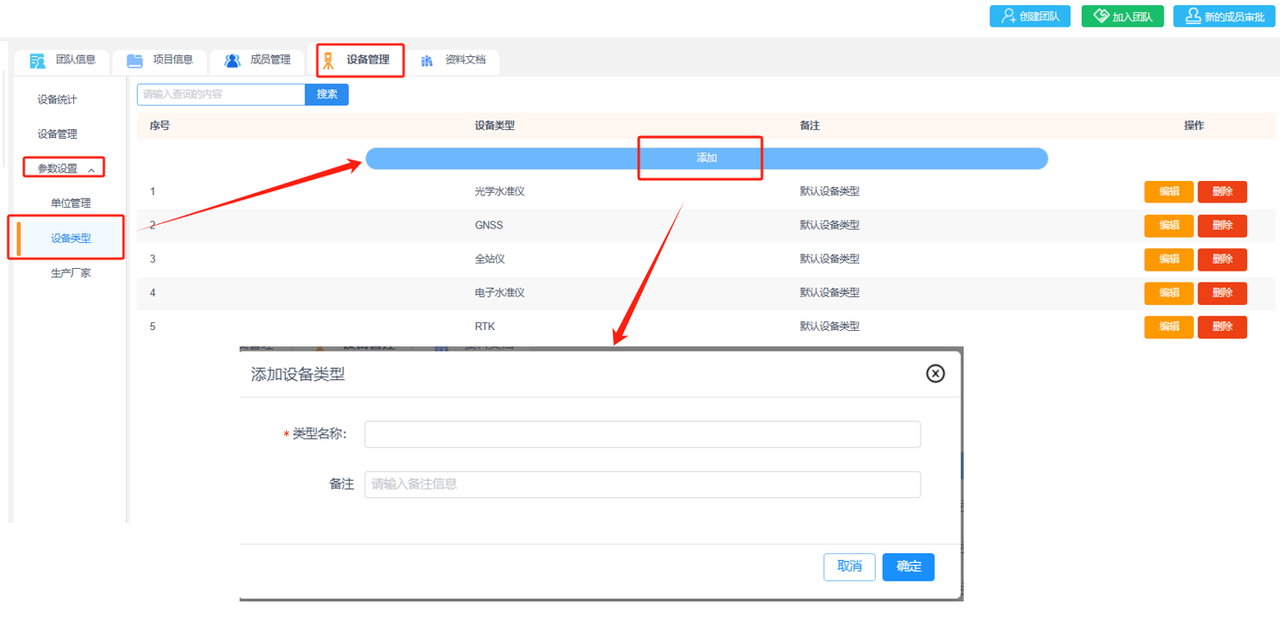 ①添加设备类型:输入设备类型名称和备注信息,添加设备类型到列表。