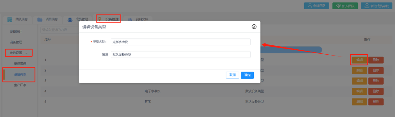 ②编辑设备类型:可编辑修改设备类型名称或备注信息。