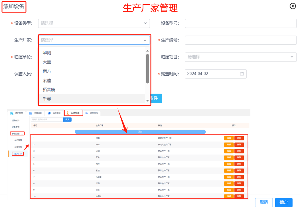 生产厂家:添加设备时,平台会提供了预设选项为默认生产厂家,可以在“参数设置-生产厂家”中添加生产厂家,编辑生产厂家或删除生产厂家。