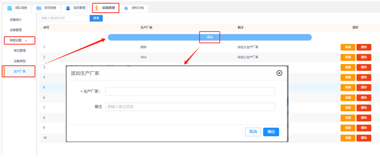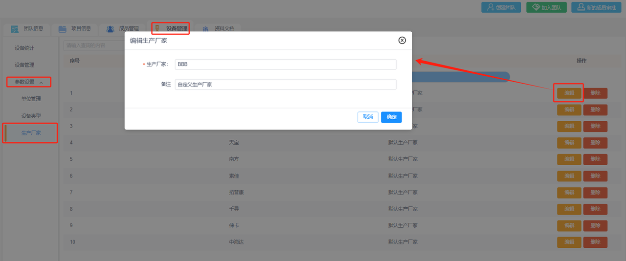 ②编辑生产厂家:可编辑修改生产厂家名称或备注信息。