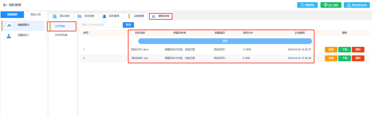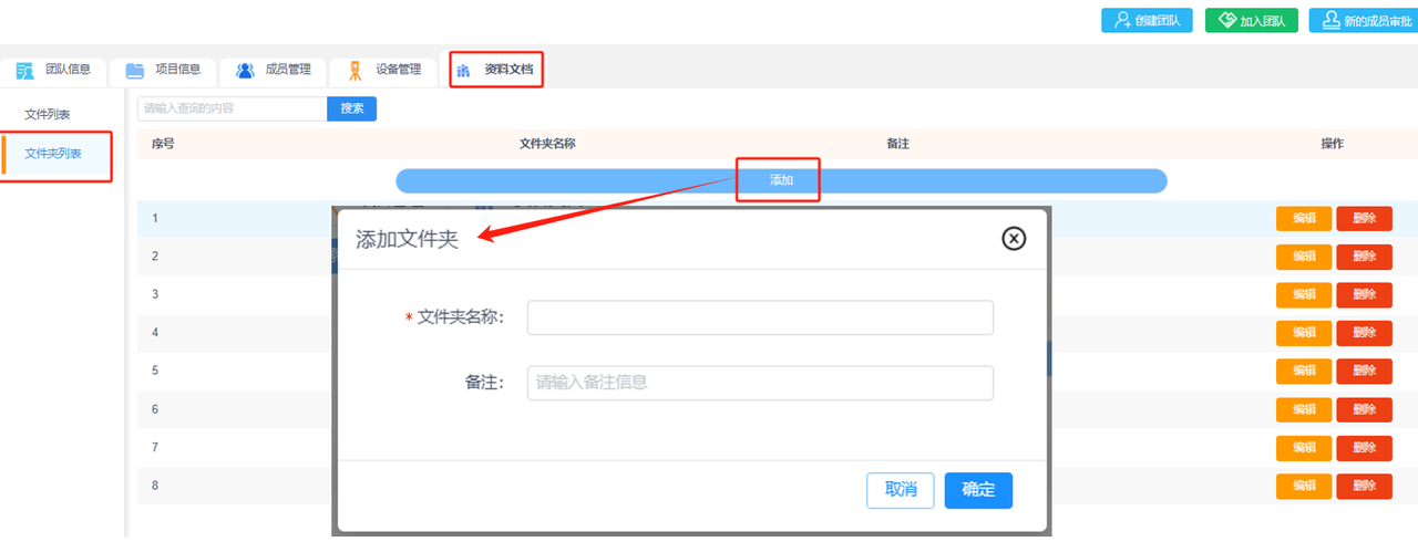 为方便对团队资料进行管理,可上传文件至“资料文档”处,并分类到对应文件夹和所属项目进行管理。