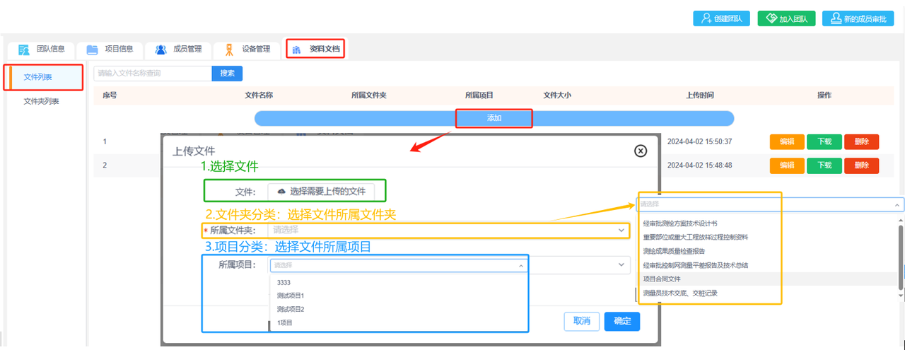 添加文件:进入“文件列表”,点击“添加”开始添加文件。选择文件上传,选择所属文件夹分类,选择所属项目分类。