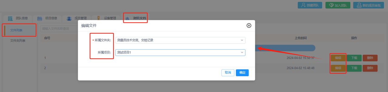编辑文件:点击“文件列表-编辑”,可修改已上传文件的所属文件夹或和所属项目。