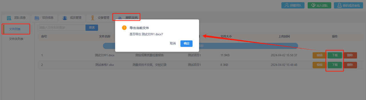 a.文件列表:在文件列表中会显示该团队所有已上传的文件,展示对应文件的文件名称、所属文件夹、所属项目、文件大小和上传时间等相关信息