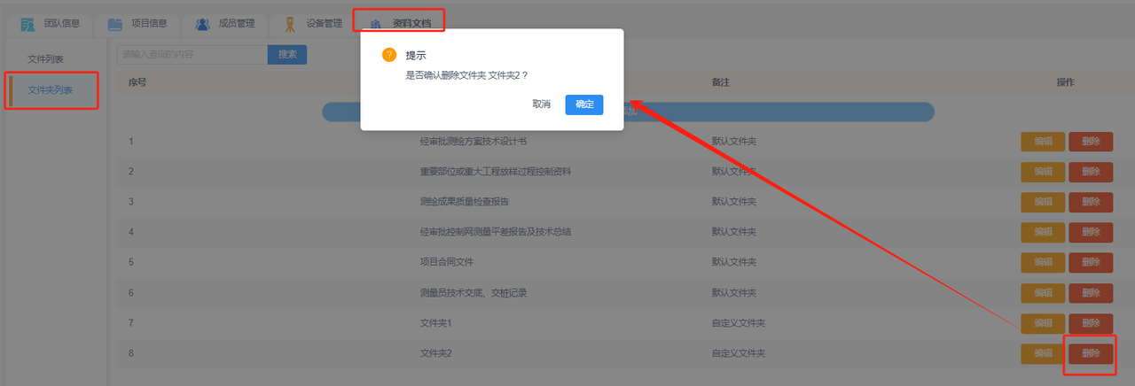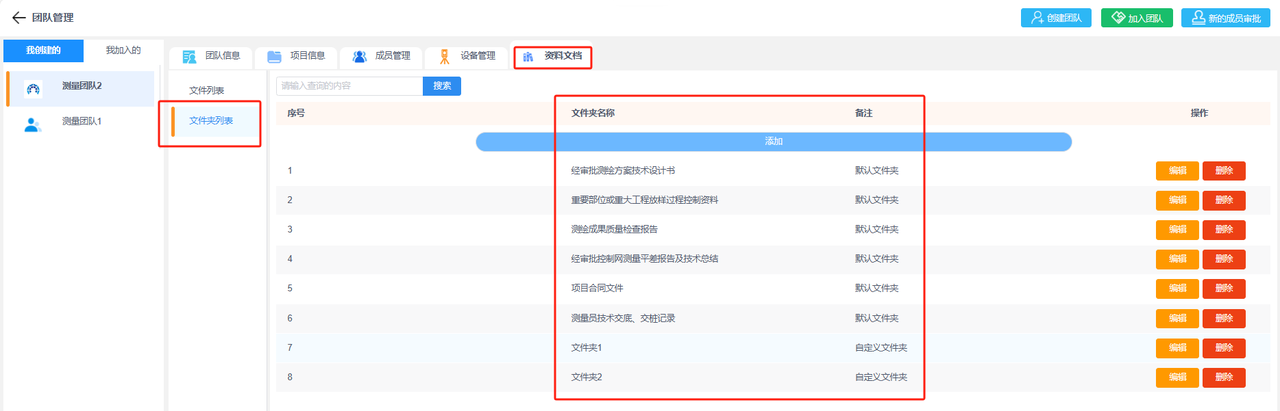 b.文件夹列表:“文件夹”主要用于分类“文件列表”中已上传的文件,在“文件列表”上传文件时需要选择文件“所属文件夹”。平台默认设置了几个常用的文件夹分类,您也可以根据现场需要添加文件夹、编辑文件夹或删除文件夹。