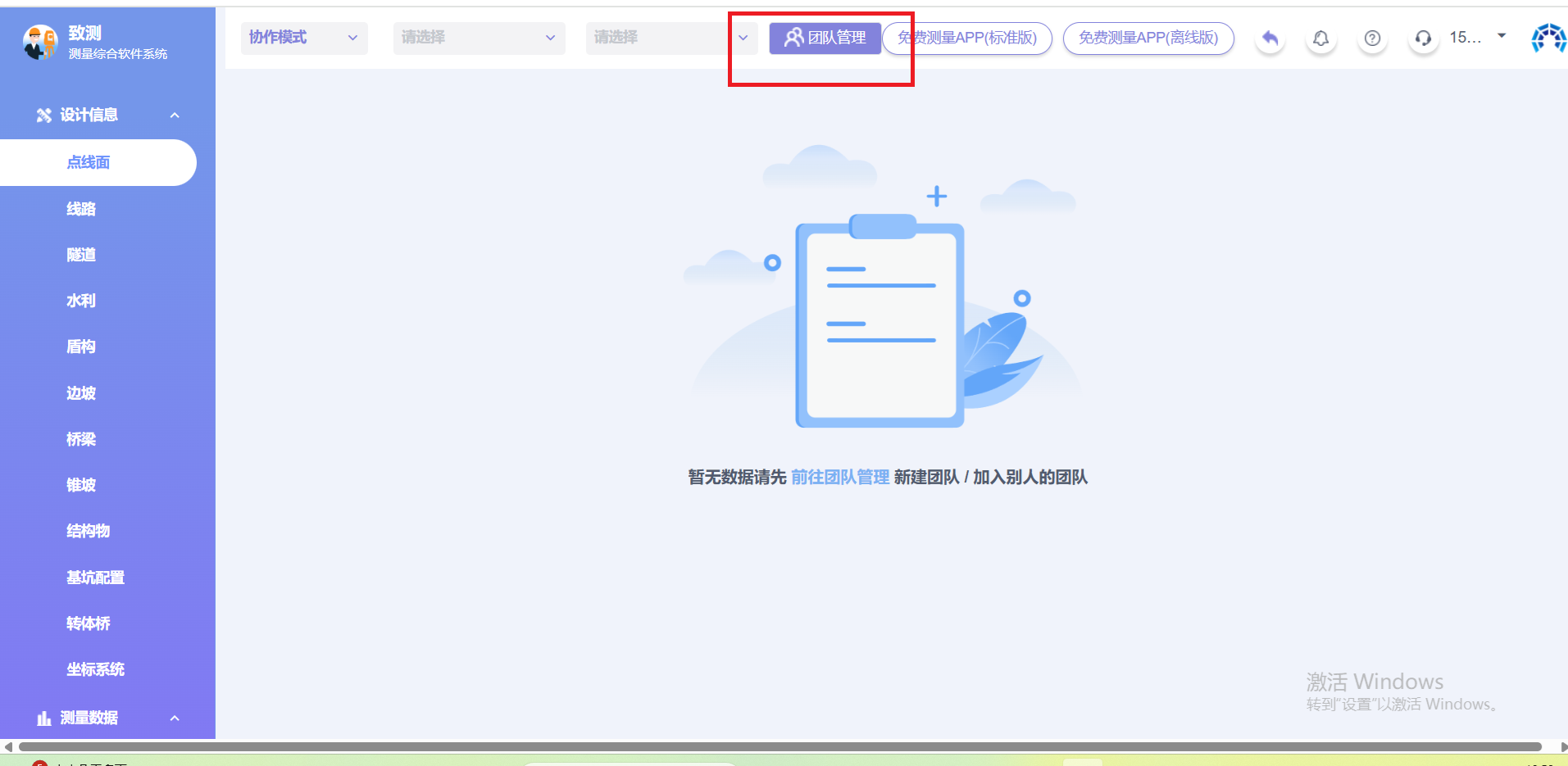 进入协作模式页面后,点击上方“团队管理”按钮,进入“团队管理”界面