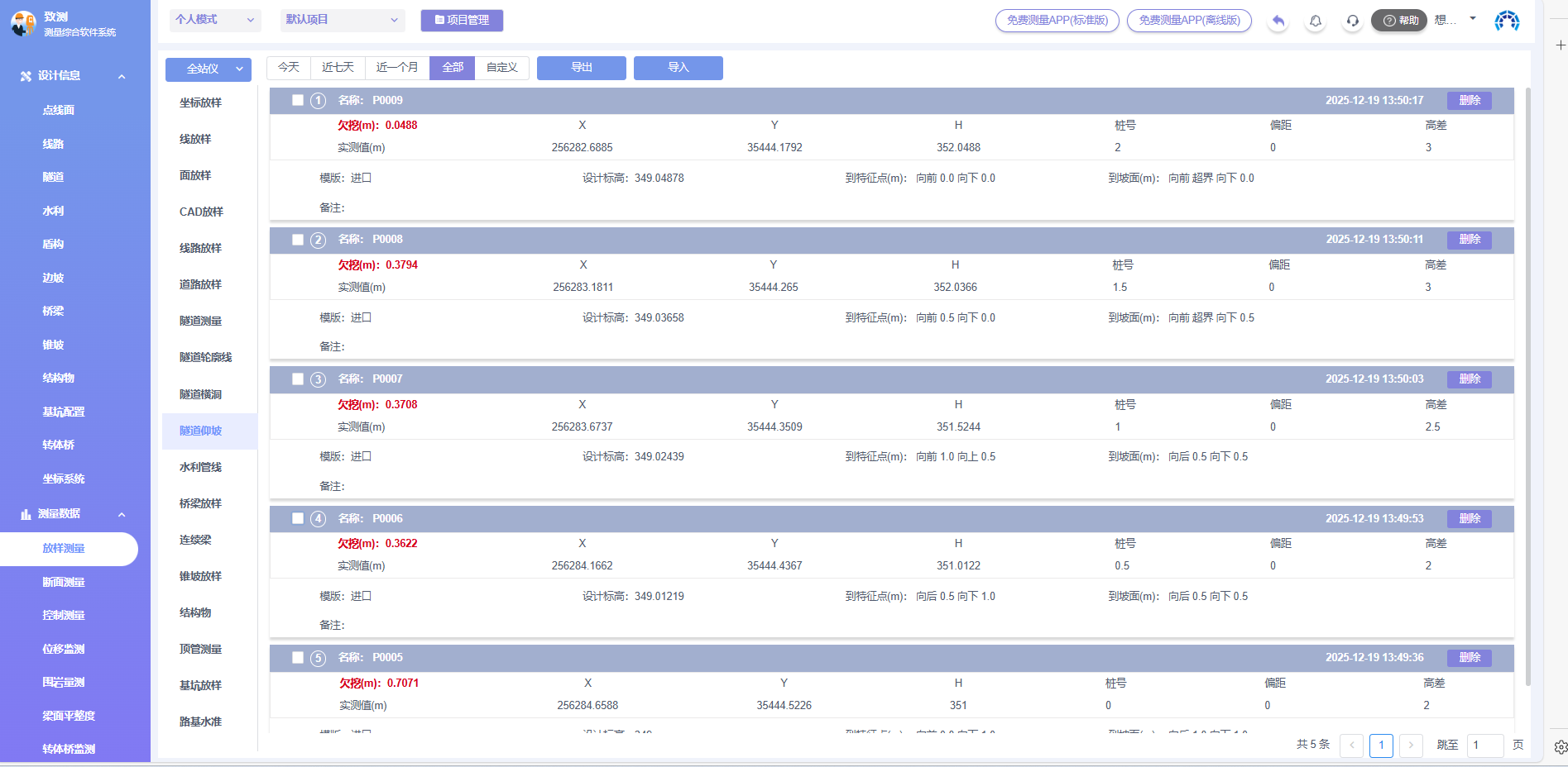 进入致测平台,左侧目录栏进入【放样测量】>【隧道仰坡】,可查看、筛选、删除、导入导出放样成果数据。