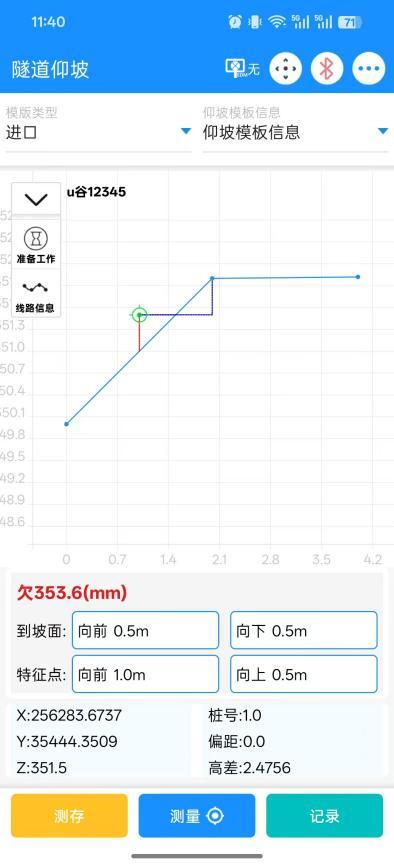 对准目标点后,点击“测量”或“测存”按钮,测量数据返回后,在界面上会显示仰坡断面、实测点等图示信息,下方会显示测量点坐标、桩号等实测信息以及超欠挖值等计算信息;也可手动输入坐标、桩号、偏距、高差进行计算。
