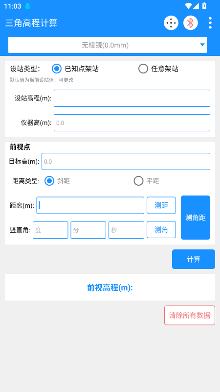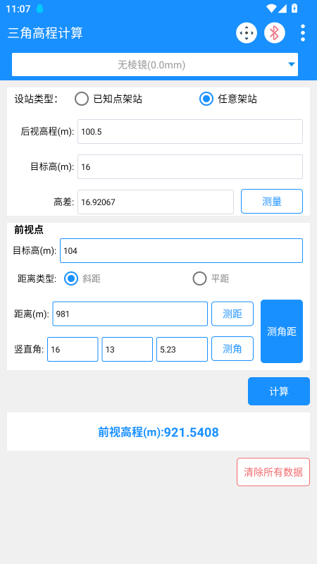 6.点击“计算”按钮,APP自动计算出前视点高程。计算出的数据会保存在当前界面,方便下次查看,点击“清除所有数据”可清除当前界面数据和已保存的数据;