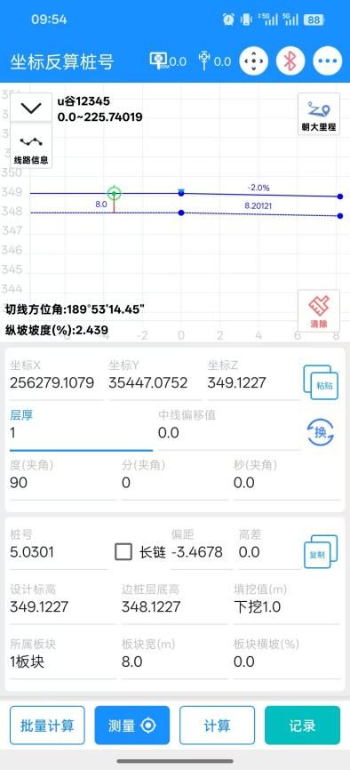 点击“计算”,软件自动根据坐标XYZ等参数反算桩号、偏距、高差,并同步显示设计标高、边桩层底高、填挖值、所属板块、板块宽度、板块横坡、切线方位角和纵坡坡度。点击“记录”保存当前成果,长按“记录”可自定义点名和备注;右上更多菜单可进入测量记录。