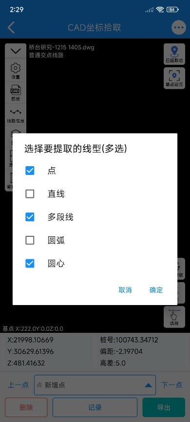 点击“选点”,拖动选点箭头捕捉需要的位置,松手后显示该点的坐标;
