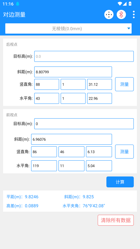3.点击“计算”按钮,即可得到两点之间的平距、斜距、高差以及水平夹角。计算得到的数据会保存在当前界面,方便下次查看,点击“清除所有数据”可清除当前界面和保存的数据;