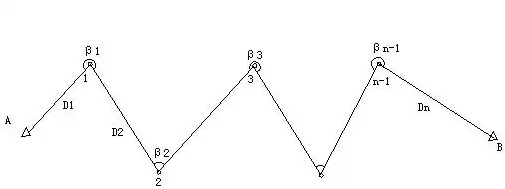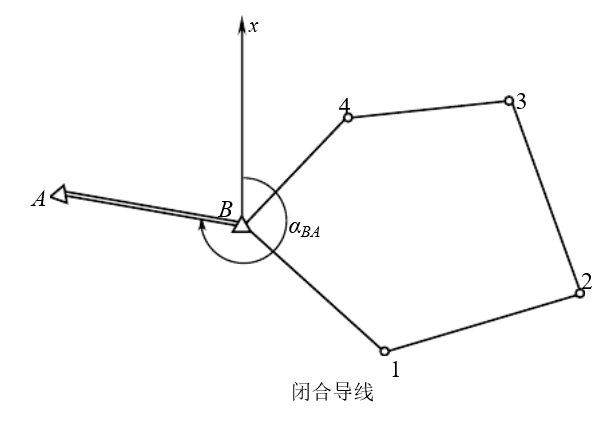 4. 无定向导线:从单一控制点出发(没有已知方向),测量若干个边长和夹角后抵达另一个控制点的导线测量方法;由于是假定的方位角,所以精度低于附和导线,但比支导线精度高。
