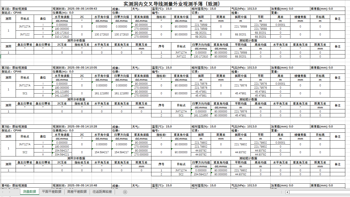 此页签展示本站经过归零、平均、数据改正之后的角距数据,此数据为本站进入平差前的最终数据;