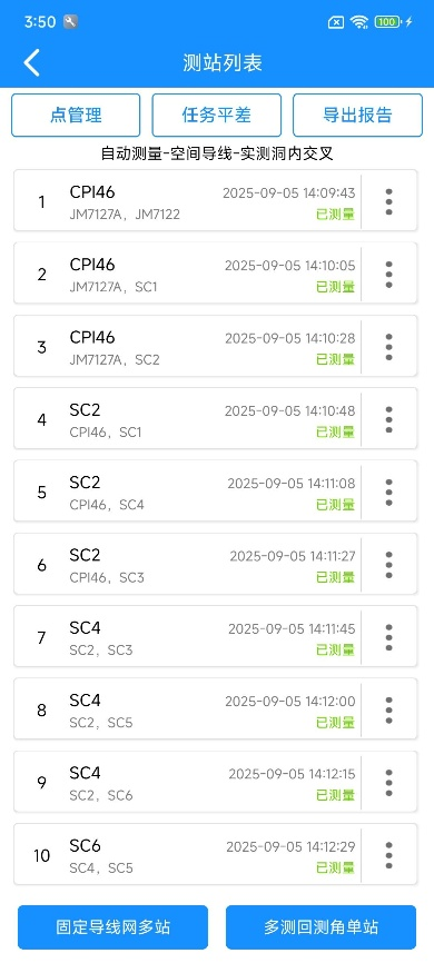 所有测回测量完成后,您可以通过点击顶部【第1测回】、【第2测回】等标签,切换查看不同测回的详细数据,并可选择进行单点重测。当发现某个点的数据超限或有误,可以对该点进行重测,无需重测整个测站。